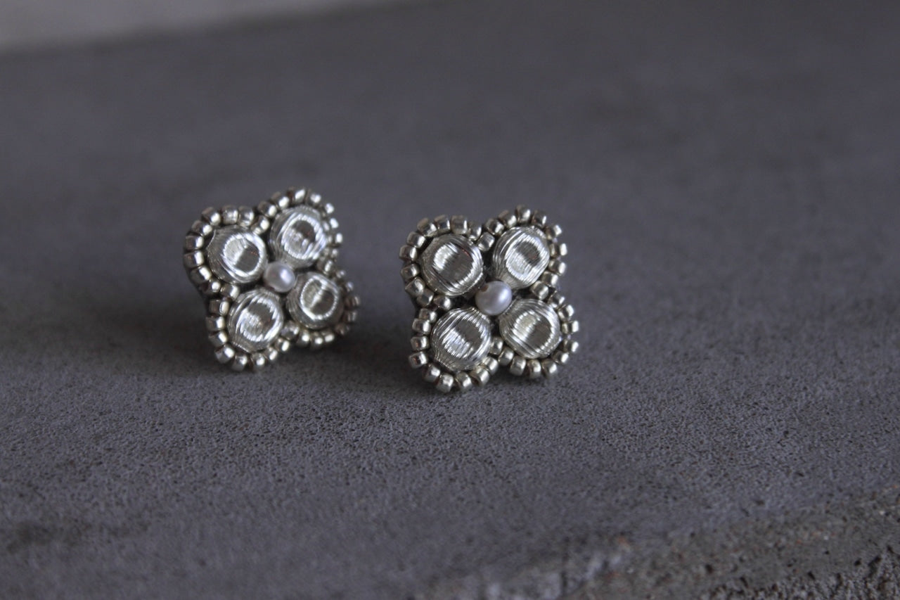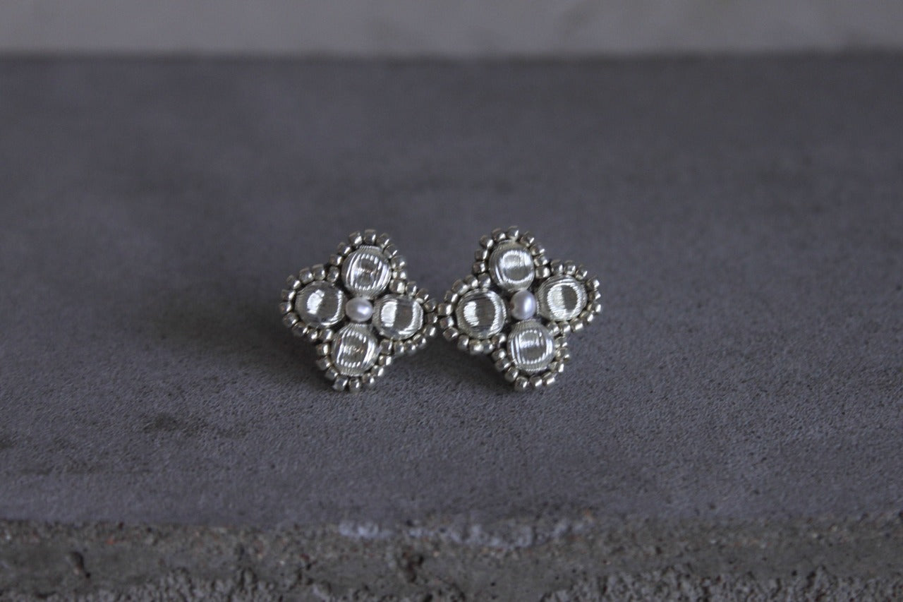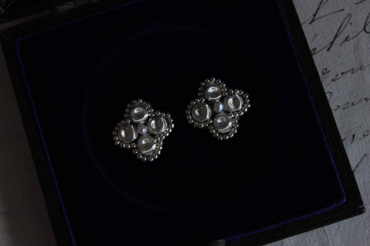採用復古法式舒芙蕾珠製成,飾以花朵圖案,中心點綴著一顆小珍珠。